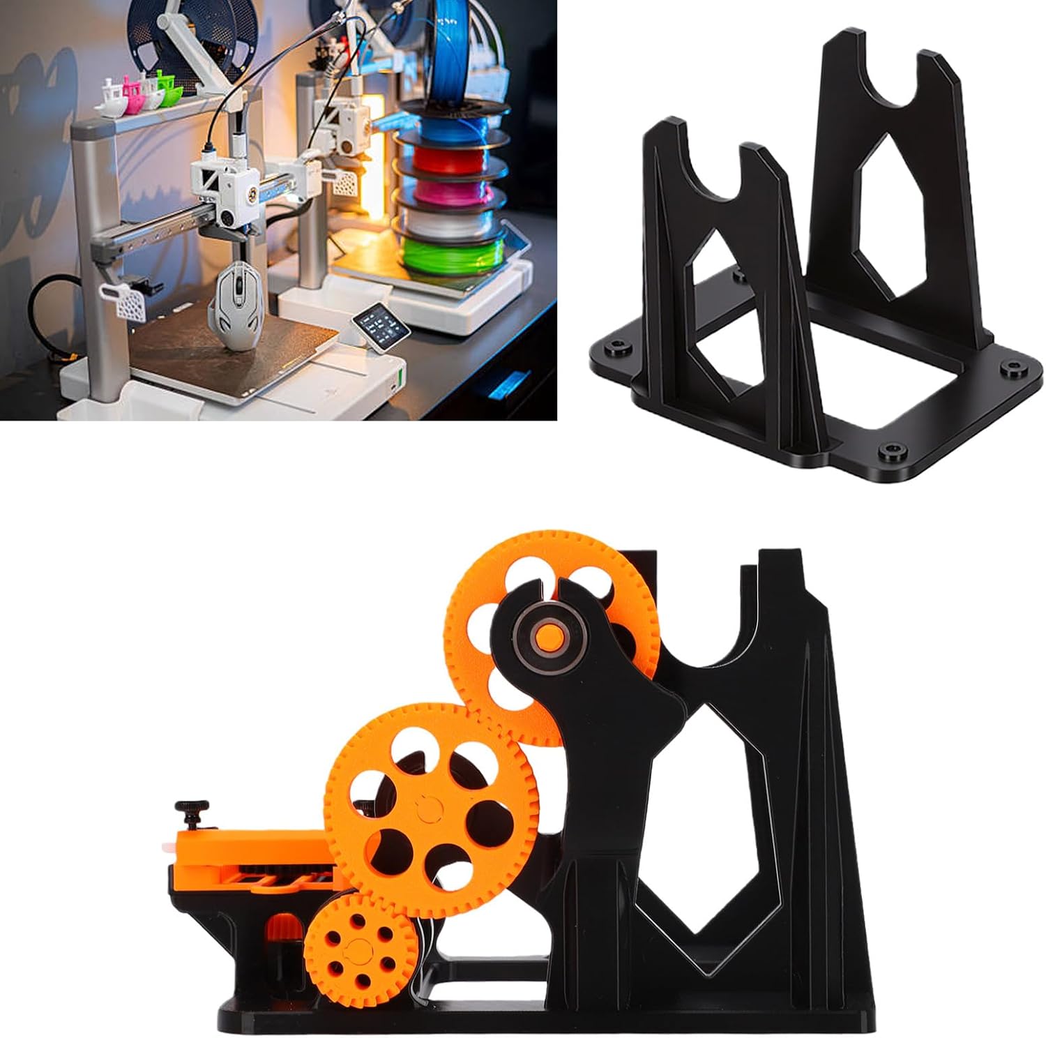 1. [Applicable Model] This filament spool winder is designed to fit for P1S, fit for P1P, fit for X1, fit for 3D printer, can maintain precise alignment and clearance in any configuration for stable and reliable use. 2. [Simplify Spool Management] Organize and wind multiple filament spools neatly near the printer, reducing clutter, simplifying the use of filament during long or multi color printing processes. 3. [Optimize AMS Workflow] This filament winder provides a clean and easily accessible backup or manual loading spool temporary storage area, improving the automatic filament system function, and will not interfere with AMS operation. 4. [Easy Installation] The kit provides intuitive snap on components, can be securely installed on standard V groove rails or printer frames through included hardware. 5. [Smooth Delivery] The filament winder integrates tube and bearing, ensuring smooth filament delivery from the spool to the extruder, minimizing resisting force and preventing entanglement during the printing process. Specification: Item Type: 3D Printer Filament Winder Material: PETG Application: Fit for P1S, Fit for P1P, Fit for X1, Fit for Color: Black and Orange How to Use: Match the appropriate model type before use. packing list: 1 x Main Unit 10 x Accessories