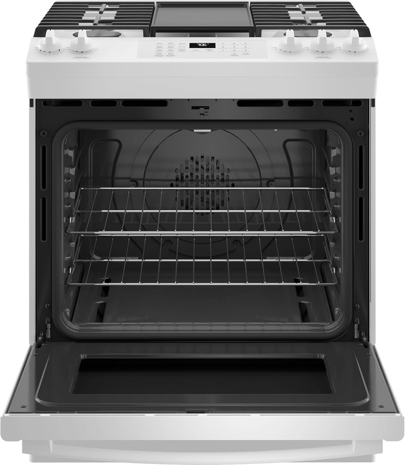 GE Appliances is your home for the best kitchen appliances, home products, parts and accessories, and support. No Preheat Air Fry Built-in WiFi Fit Guarantee Dimensions: 36 1/4 H x 30 W x 29 1/4 D No Preheat Air Fry Cook healthier, crispier versions of your favorite foods in less time, thanks to an air fryer right in your oven that doesn’t require preheating, a basket or a special tray Built-in WiFi This smart oven features built-in WiFi so you can control oven functions with the SmartHQ app on your smart device Play Video Fit Guarantee Replace your old 30” free-standing range with a new 30" slide-in model. GE slide-in ranges are guaranteed for an exact fit or GE Appliances will pay up to $300 toward modifications. See offer criteria and details Play Video Edge-to-edge cooktop A large cooking surface gives you extra room for pots and pans of all sizes and lets cookware move easily from burner to burner Extra-large integrated non-stick griddle Cook up to six grilled cheeses at once on the industry’s largest integrated griddle 18,000 BTU Power Boil burner Prepare your favorite pasta dishes faster by boiling water in less time Gas convection Evenly bake foods like roasts and cookies with this helpful feature that uses a fan to circulate heated air Play Video Self-clean with Steam Clean option Clean your oven the way you want 10,000 BTU oval burner Large oval fifth burner is ideal for griddle or odd-size cookware Play Video Heavy duty, dishwasher safe grates Easily and safely clean grates in the dishwasher or place in the bottom of the self-clean oven Precise Simmer burner Delicate foods don’t burn with low, even heat Play Video Use and Care Manual Installation Instructions Kitchen Safety Tips Quick Specs LP Conversion Kit CAD Files 3D CAD Files 2D Plan CAD Files 2D Elevation