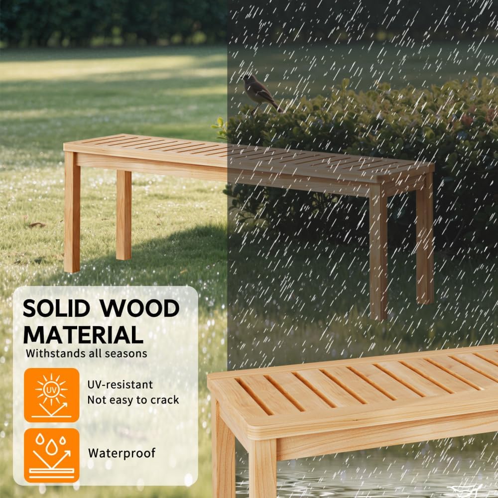 Main Material:Solid Wood Premium Knot-Free Pine Wood: Crafted from solid, knot-free pine wood for a smooth, ensuring long-lasting durability and strength. Backless Slatted Seat Design: The open slatted design adds modern charm while ensuring breathability and quick drying after rain—ideal for patio or garden use. Generous 52.1" Length: Perfectly sized to seat two people comfortably, making it a functional addition to entryways, dining areas, or outdoor gatherings. ️ Versatile for Indoor & Outdoor Use: Weather-resistant materials make this bench equally suitable for your hallway, living room, bedroom, or under a covered porch or backyard setup. ️ Easy Assembly & Classic Look: Simple to put together with all hardware included. The timeless natural wood finish blends seamlessly with rustic, farmhouse, or modern décor.