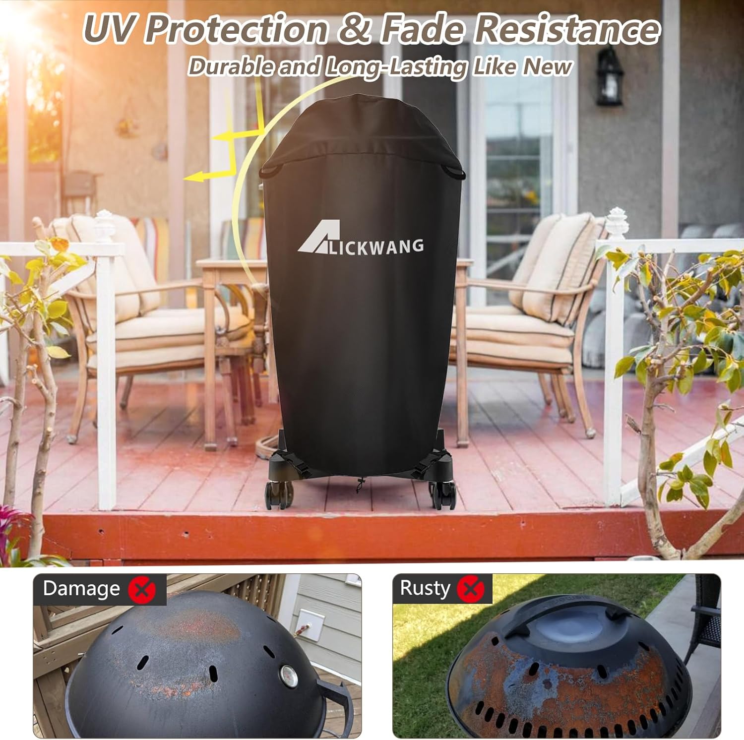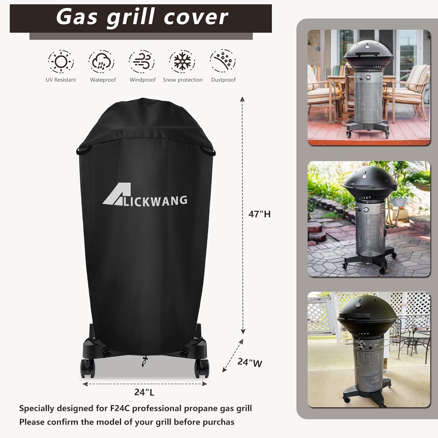 Size:24" L x 24" W x 47" HFabric:Made of heavy duty waterproof 600D Oxford,which is stury and durable.F24C professional propane gas grill This grill cover is specially for F24C professional propane gas grill.It is is made of heavy duty waterproof 600D Oxford fabric,which is stury and durable,which is waterproof,dustproof,durable and tear-resistant,it can withstand various harsh factors,both patio,backyard,deck,porch or lawn,you will no need to clean the griddle every day,it will save your time and money.There has a big air vent on the griddle cover,which can support good air circulation when the cover is locked by buckles,you never have to worry about the cover expanding in the wind and water vapor condenses on the.