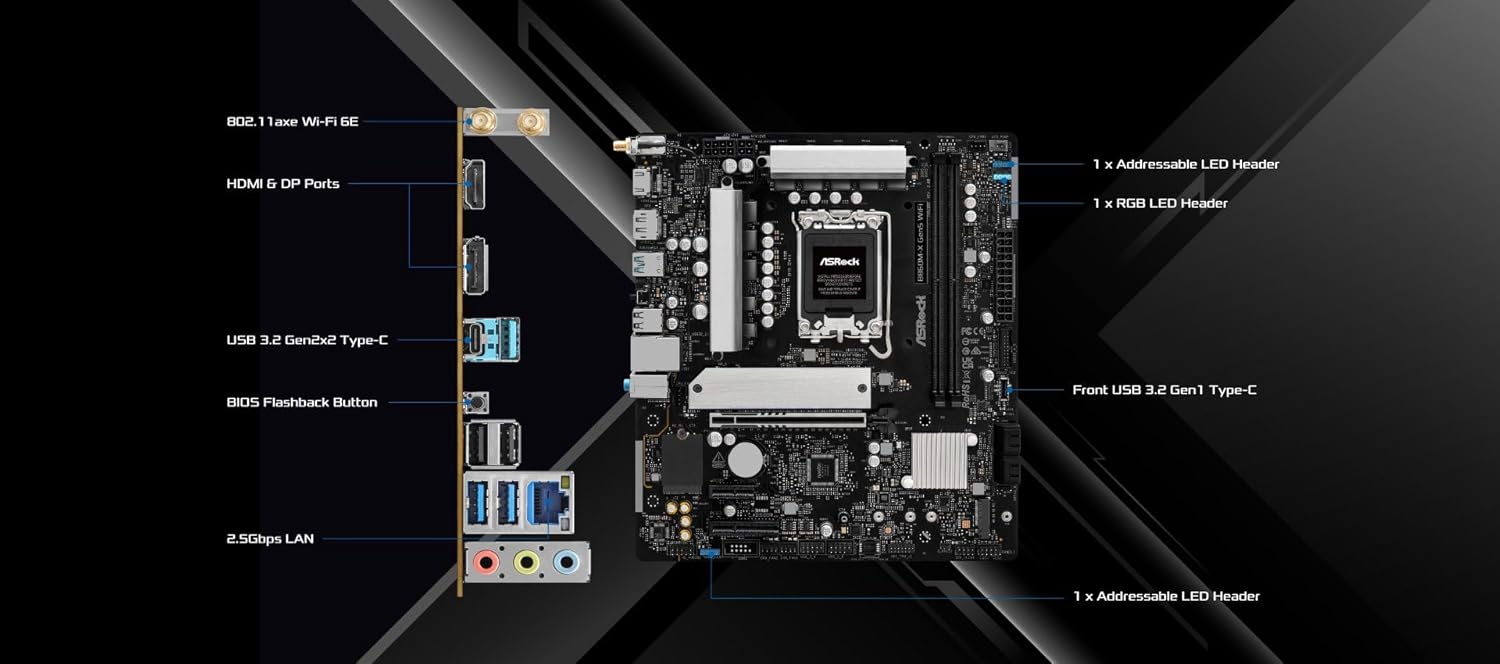 The ASRock B860M-X Gen5 WiFi is a compact yet capable Micro-ATX motherboard built for Intel's new Core Ultra Series 2 processors. It delivers a compelling mix of next-generation features in a space-saving design, making it an excellent choice for building a powerful and efficient system. With support for exceptional DDR5 memory speeds up to 9066+ (OC) and a robust 7+1+1+1+1 power phase design, this board ensures responsive performance for gaming, content creation, and daily multitasking. This motherboard is ready for the future, featuring both a PCIe 5.0 x16 slot for upcoming graphics cards and a PCIe 5.0 M.2 slot for lightning-fast NVMe storage. Connectivity is comprehensive, with a high-bandwidth USB 3.2 Gen2x2 Type-C port on the rear I/O, modern WiFi 6E, and a 2.5G LAN port. The inclusion of BIOS Flashback provides added peace of mind for easy system maintenance and updates. Ideal for builders seeking modern features in a compact form factor, the B860M-X Gen5 WiFi proves that you don't need a full-sized ATX board to access cutting-edge technology. Whether you're assembling a streamlined gaming PC, a productive home office workstation, or a media center, this motherboard offers the essential performance, expandability, and reliable connectivity needed for a successful build.