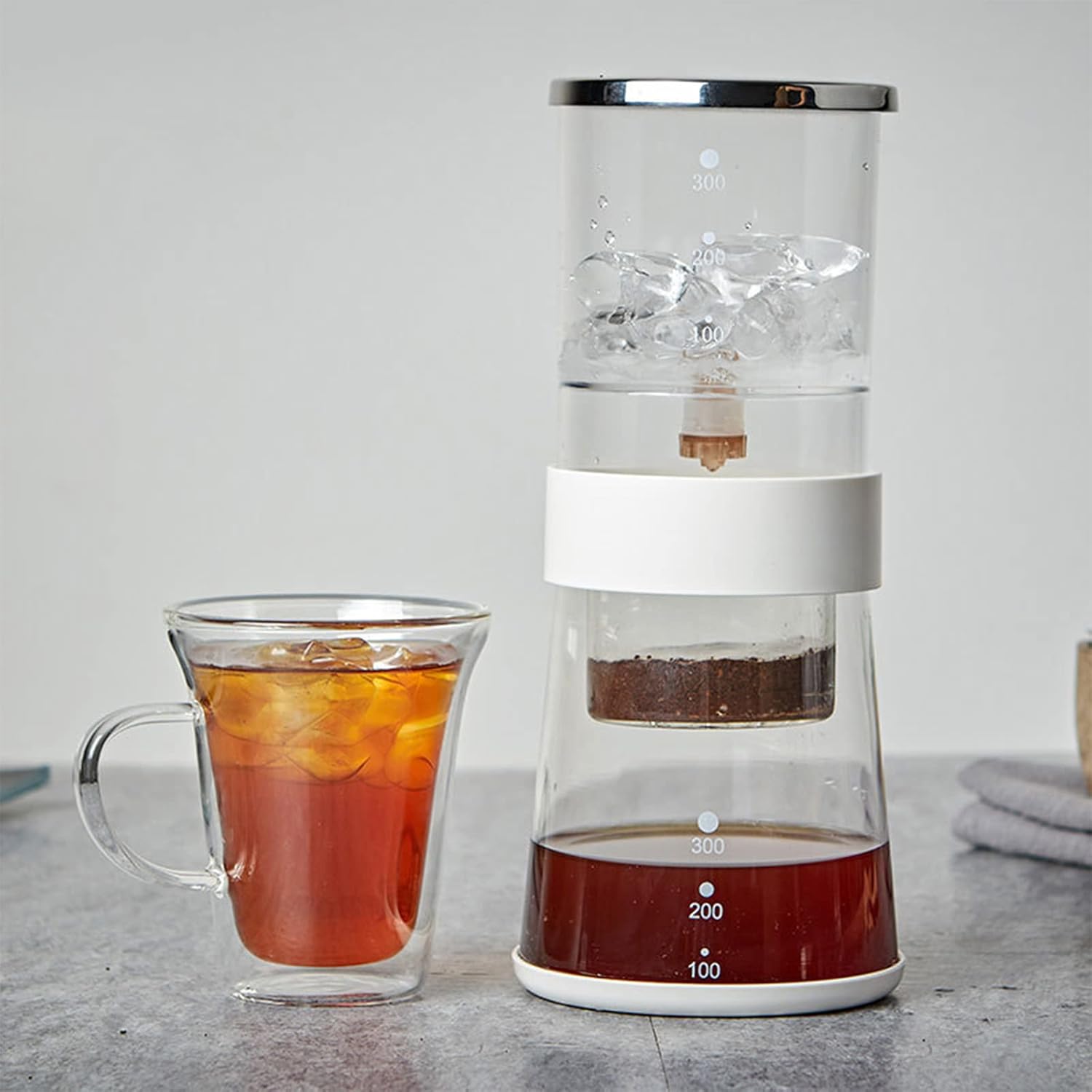 Name:Iced drip coffee makercolor: WhiteCapacity: 400mlSpecifications: 101*234*102.5mmMaterial: upper cover (stainless steel)Upper pot strainer (PC)Filter (borosilicate glass + stainless steel filter)Lower pot (high borosilicate glass)